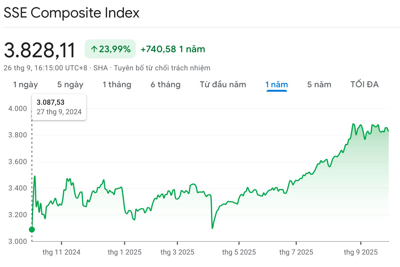 Đà tăng của Shanghai Composite trong 1 năm qua.