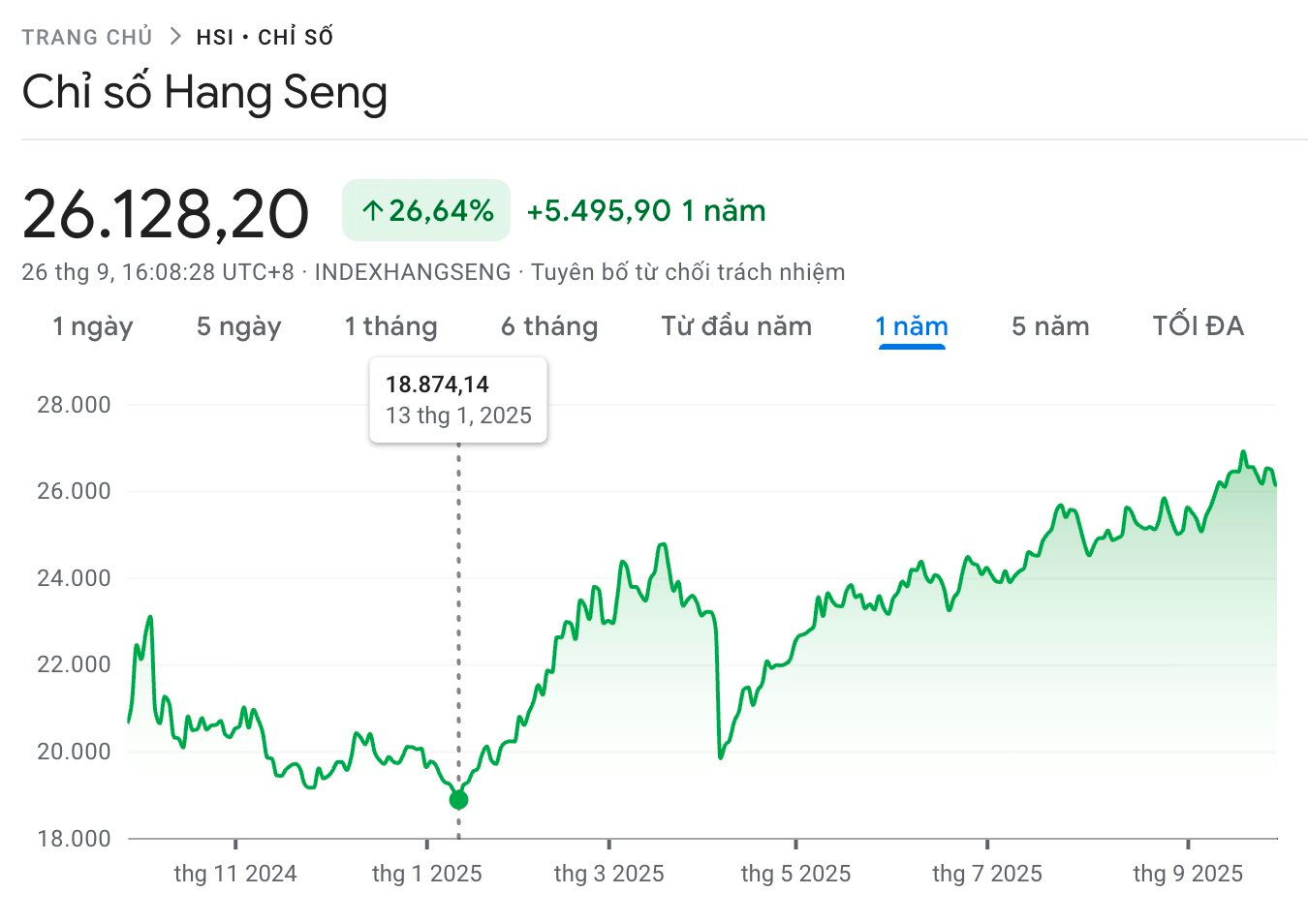 Đà tăng của Hang Seng Index trong 1 năm qua.