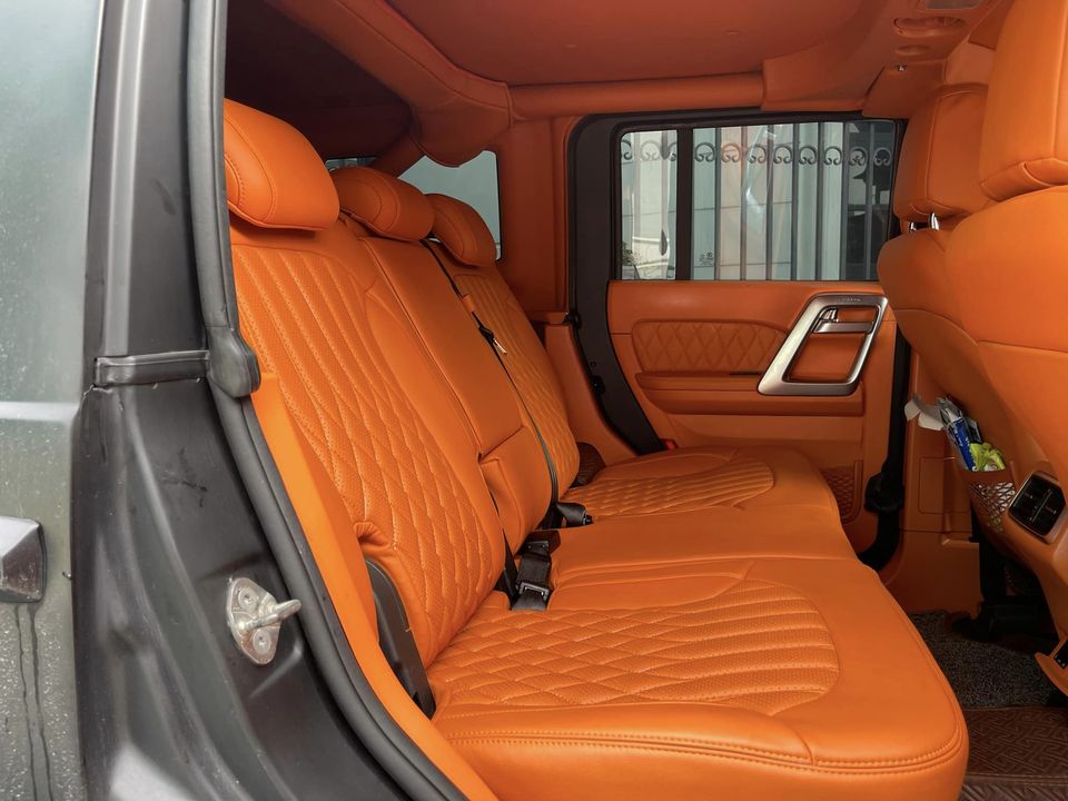 Bên trong nội thất, chiếc BAIC BJ40 rao bán bọc toàn bộ ghế ngồi, táp-pi cửa, vô lăng sang màu cam đặc trưng của thương hiệu thời trang Hermes. Thậm chí, trần xe cũng có tông màu cam tương tự. Điểm xuyết là họa tiết sợi carbon ở bảng táp-lô.
