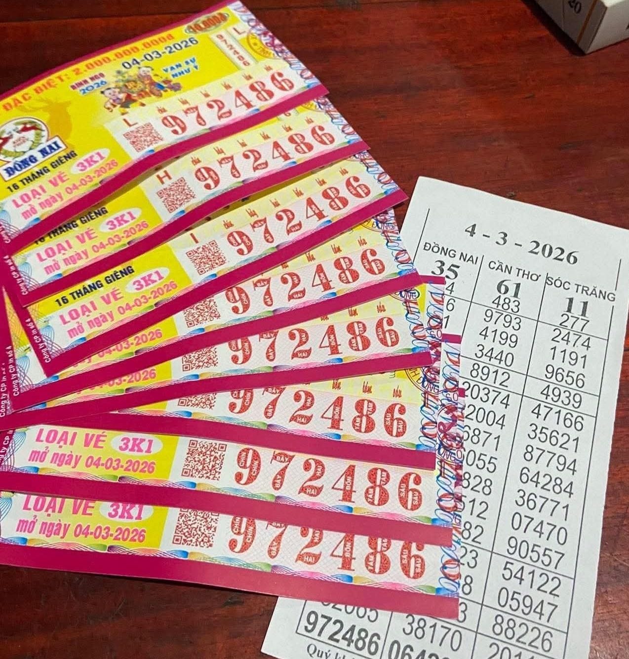 Theo đó, vé số Đồng Nai, do Công ty TNHH Một thành viên Xổ số kiến thiết Đồng Nai mở thưởng chiều 4-3, giải độc đắc (dãy số 972486) được xác định trúng tại TPHCM.
