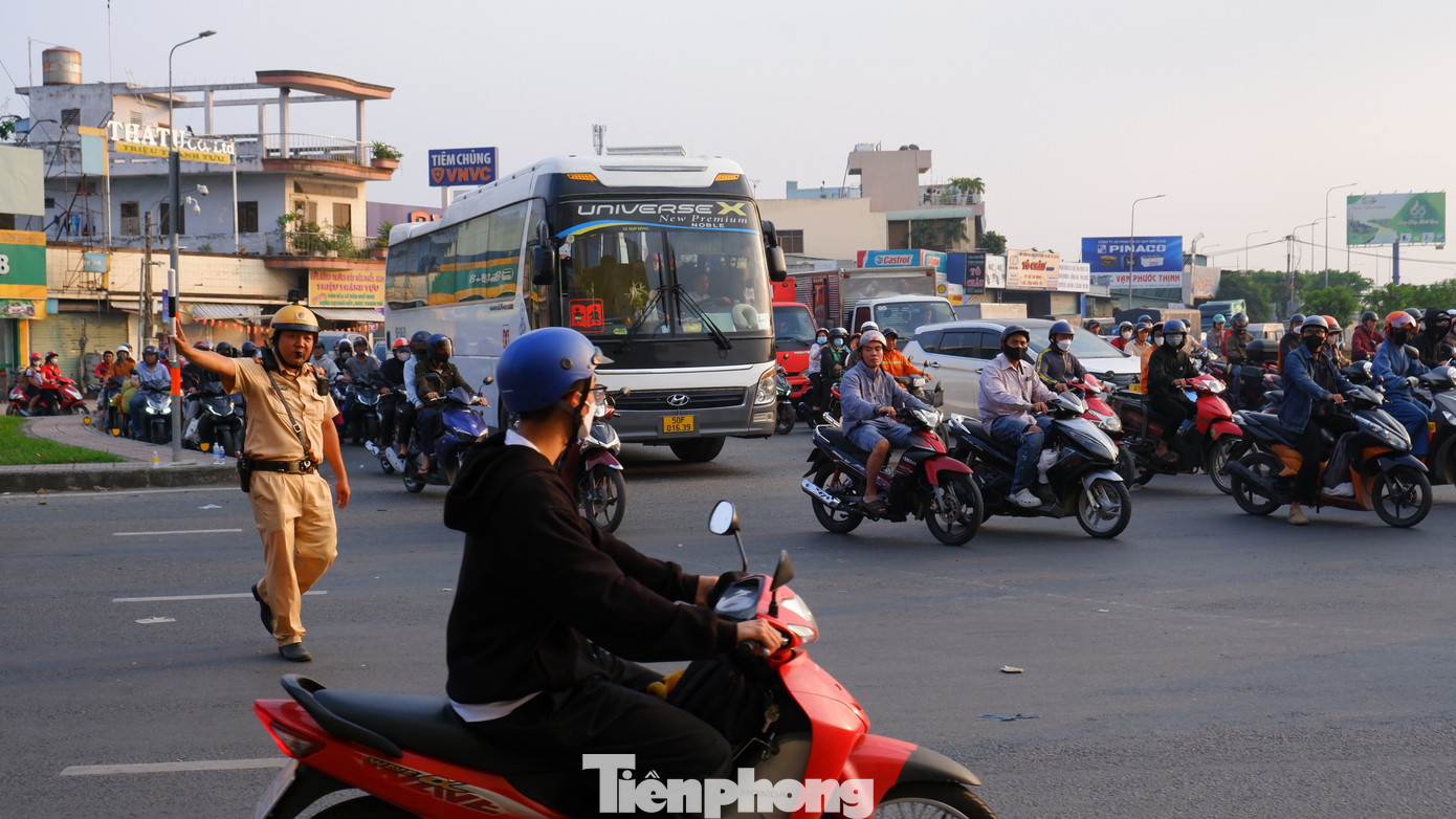 Lực lượng chức năng được bố trí điều tiết giao thông, phối hợp phân luồng tại các điểm nóng nhằm hạn chế ùn tắc. Trong ảnh: Lực lượng CSGT điều tiết phương tiện tại "điểm nóng" nút giao thông An Lạc.