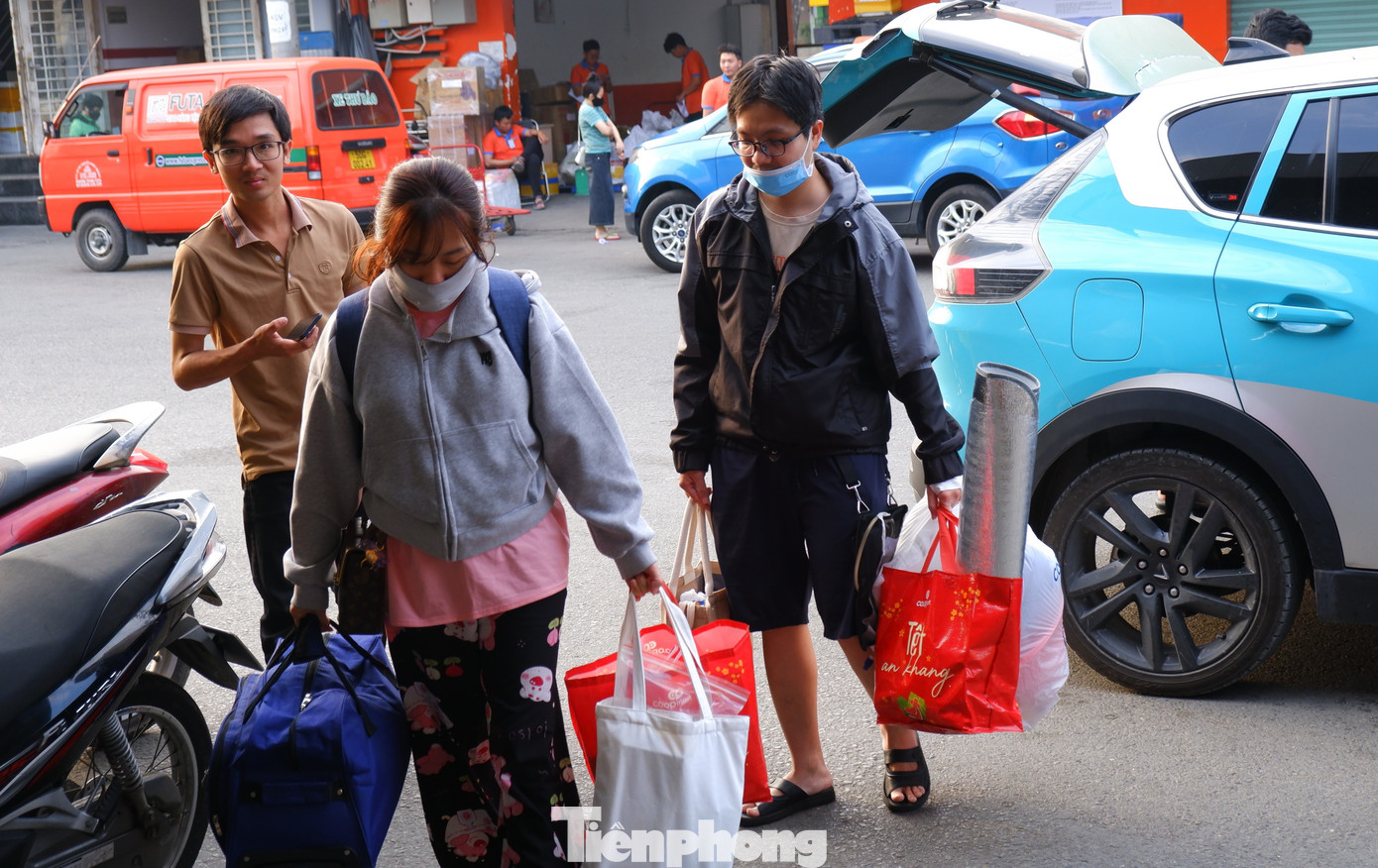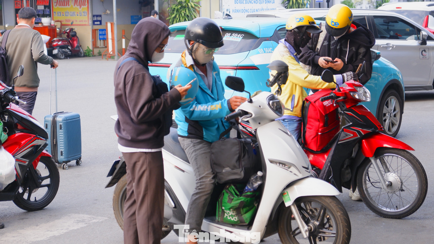 Hành khách đi xe công nghệ đến bến xe để mua vé về quê.