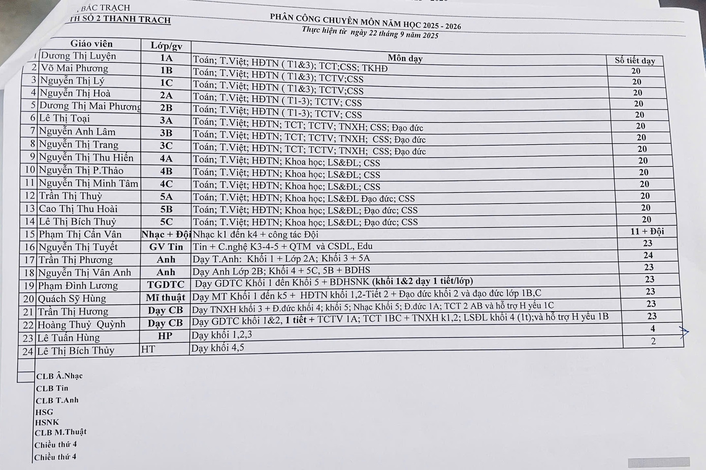 Danh sách phân công chuyên môn của nhà trường cho thấy, việc giảng dạy của Hiệu trưởng và Phó Hiệu trưởng không xác định rõ môn học, tiết học, ngày dạy, không được thể hiện bằng thời khóa biểu, kế hoạch dạy học hay giáo án theo quy định chuyên môn.