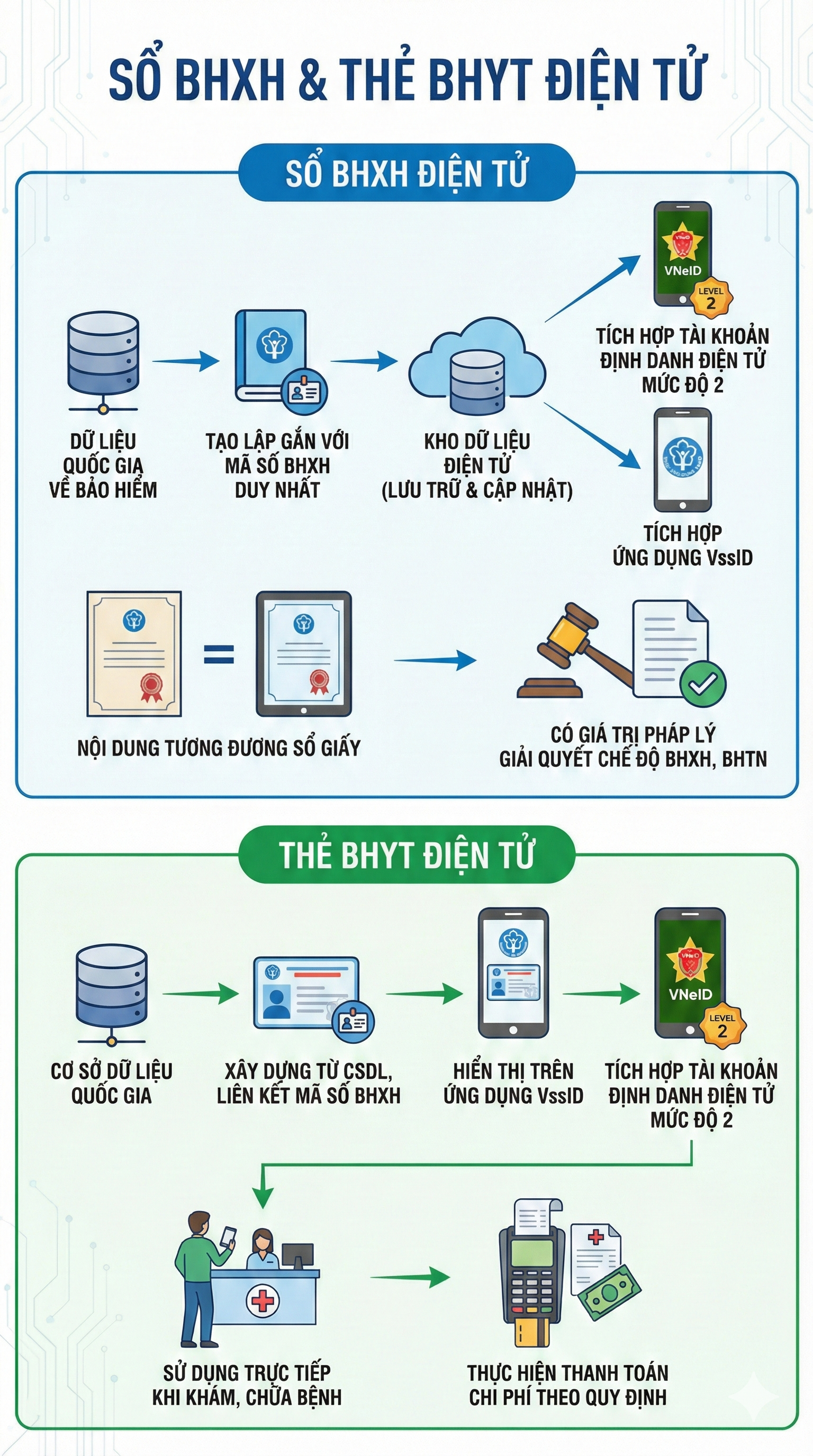 Tương tự, thẻ BHYT điện tử cũng được xây dựng từ cơ sở dữ liệu quốc gia, liên kết với mã số BHXH cá nhân và hiển thị trên ứng dụng VssID, đồng thời tích hợp với tài khoản định danh điện tử mức độ 2. Người dân có thể sử dụng trực tiếp thẻ điện tử khi đi khám, chữa bệnh và thực hiện thanh toán chi phí theo quy định.
