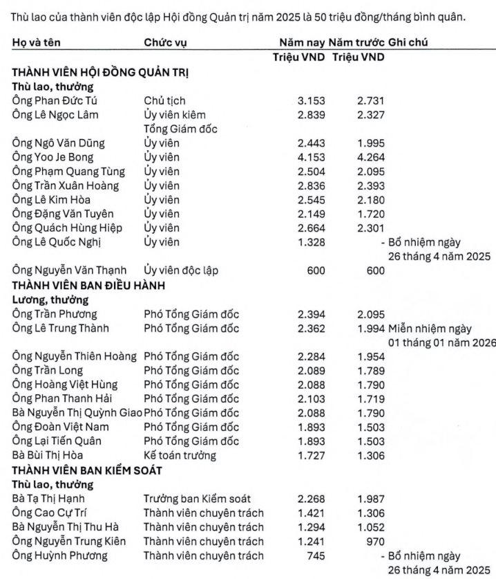 Ở Ban Điều hành, mặt bằng thu nhập cũng đồng loạt đi lên. Các Phó Tổng Giám đốc nhận từ 1,9–2,4 tỷ đồng/năm, với mức tăng phổ biến 14–20% so với năm 2024.