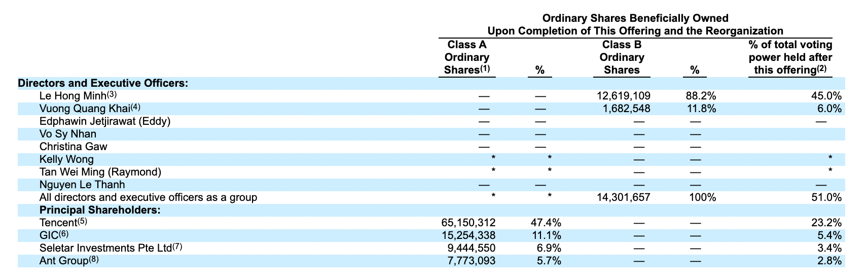 Ngoài ra, Tencent - Tập đoàn công nghệ Trung Quốc - là cổ đông ngoại lớn nhất, sở hữu hơn 65 triệu cổ phiếu loại A, tương ứng quyền biểu quyết là 23%. Sở hữu của Tencent bao gồm hơn 43 triệu cổ phiếu của Tenacious Bulldog Holdings Limited, 14,5 triệu cổ phiếu Prosperous Prince Enterprises Limited và hơn 7,5 triệu cổ phiếu sẽ phát hành sau khi hoàn tất IPO.