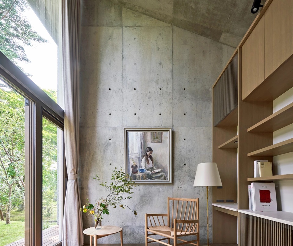 Cả hai khu nhà đều sử dụng mái dốc gấp chéo, tạo sự thống nhất về hình khối. Chiều cao thoáng từ sàn lên trần giúp không gian bên trong ấm cúng, dễ chịu.