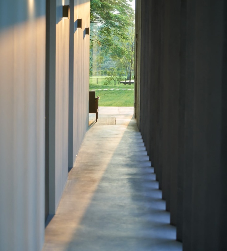Một hành lang nhìn từ lối phía nam của khu nhà phụ. Bên trái hành lang là phòng ngủ, phòng tắm và phòng trà
