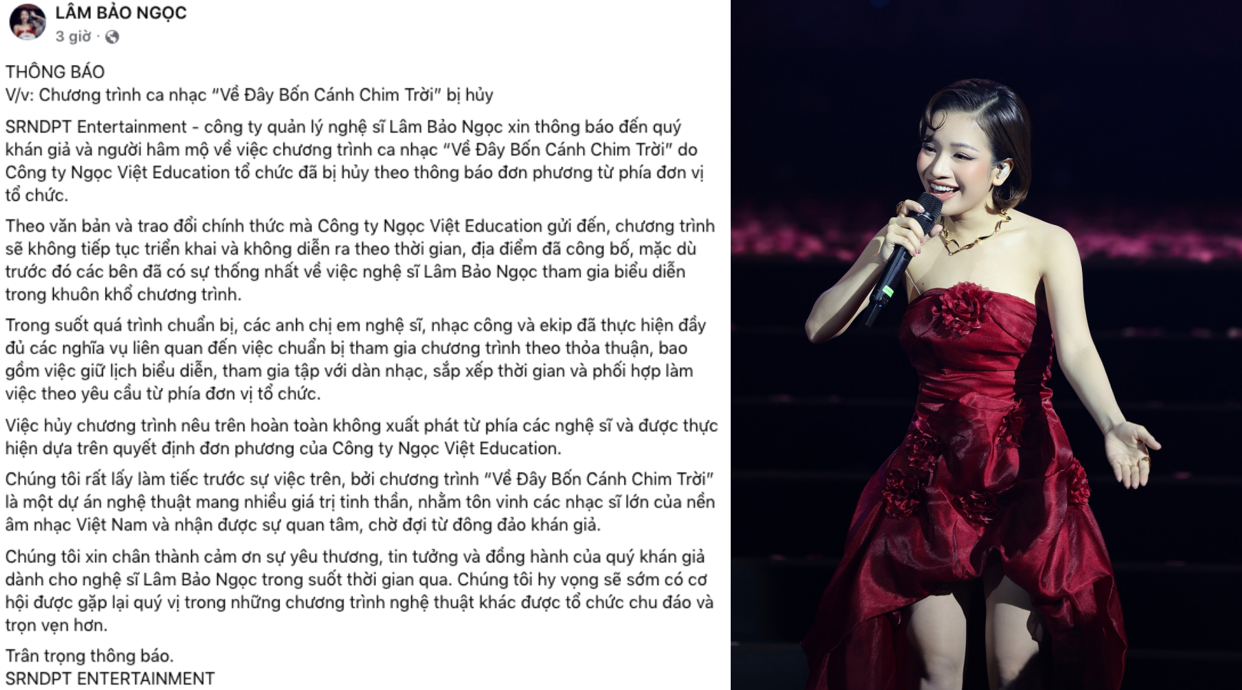 Không lâu sau đó, công ty quản lý của ca sĩ Lâm Bảo Ngọc - SRNDPT Entertainment cũng phát đi thông báo xác nhận chương trình Về đây bốn cánh chim trời đã bị hủy theo thông báo đơn phương từ phía đơn vị tổ chức là Công ty Ngọc Việt Education. Theo nội dung văn bản, dù các bên đã thống nhất việc nghệ sĩ tham gia biểu diễn và đã hoàn tất các nghĩa vụ chuẩn bị như giữ lịch, tập luyện, phối hợp cùng dàn nhạc, chương trình vẫn không tiếp tục triển khai theo thời gian và địa điểm đã công bố. Phía công ty khẳng định việc hủy show không xuất phát từ phía nghệ sĩ, đồng thời bày tỏ sự tiếc nuối khi một dự án nghệ thuật được kỳ vọng cao không thể diễn ra như kế hoạch.