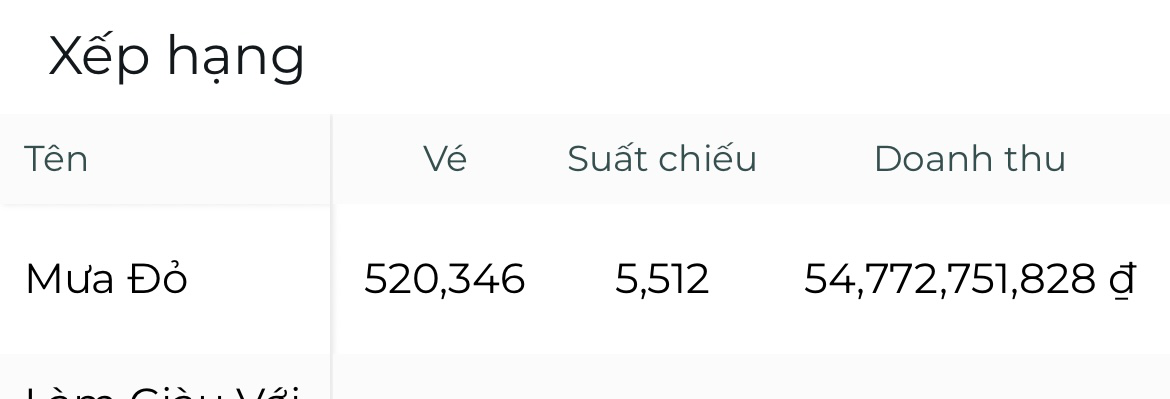 Hiện tại, tổng doanh thu của Mưa Đỏ đã ghi nhận con số 400 tỷ, trở thành phim Việt thứ 5 trong lịch sử ghi nhận dấu mốc ấn tượng này. Trước đó có 4 phim Việt ghi nhận con số trên 400 tỷ bao gồm Bố Già - Nhà Bà Nữ - Lật Mặt 7 và Mai. Đáng nói hơn khi thành tích của Bố Già là 427 tỷ và với đà tăng trưởng hiện tại thì có lẽ trong ngày 2/9, Mưa Đỏ sẽ vượt qua được dấu mốc này, chiếm lấy vị trí thứ tư trên BXH top 10 doanh thu phòng vé Việt. Thậm chí nhiều khán giả còn cho rằng chỉ trong tuần này, phim sẽ nhanh chóng chiếm được vị trí top 2 (Lật Mặt 7 với 483 tỷ) và nếu thuận lợi hơn thì là cả top 1 của Mai (551 tỷ).