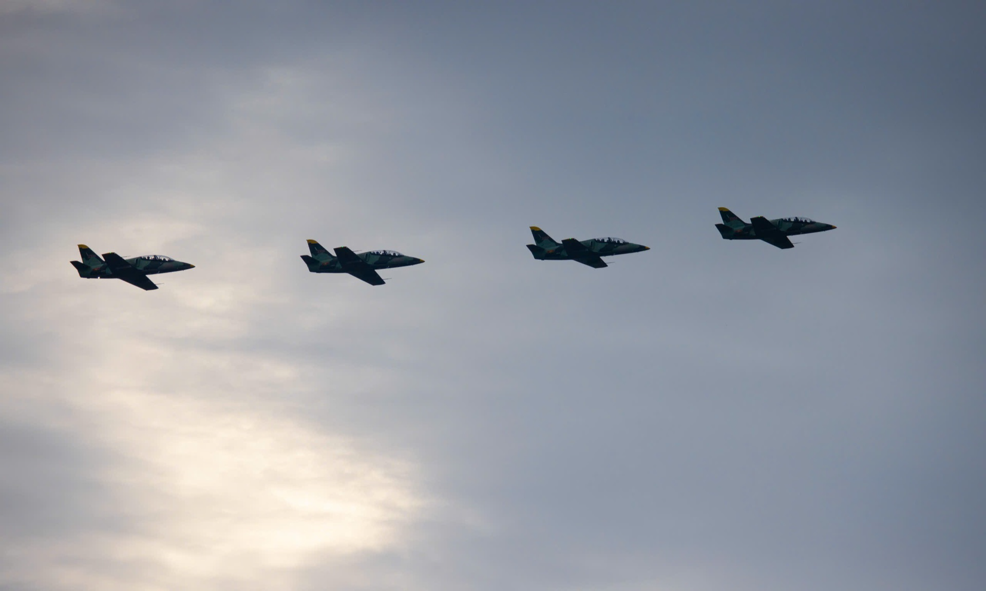 4 chiếc L-39NG bay ngang qua Quảng trường Ba Đình trong đội hình thẳng hàng, đều đặn và đẹp mắt, tạo nên khoảnh khắc hùng tráng trên bầu trời ngày đại lễ