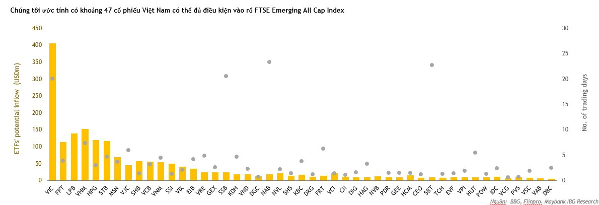 Về danh mục cổ phiếu đủ điều kiện, dựa trên dữ liệu cập nhật đến ngày 6/4/2026, bộ phận phân tích Maybank ước tính có khoảng 47 cổ phiếu Việt Nam có thể đủ điều kiện vào rổ FTSE Emerging All Cap Index, so với 28 cổ phiếu theo ước tính trước đó của FTSE vào tháng 12/2024.