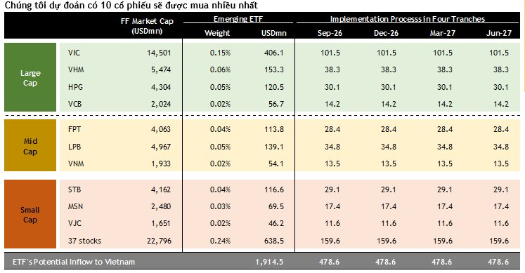 Trong nhóm cổ phiếu mở rộng này, dòng vốn được kỳ vọng sẽ tập trung chủ yếu vào các mã vốn hóa lớn và thanh khoản cao, trong đó các cổ phiếu như Vingroup (VIC), Vinhomes (VHM), Hoa Phat (HPG), Vietcombank (VCB), FPT (FPT), LienVietPostBank (LPB), Vinamilk (VNM), Sacombank (STB), Masan Group (MSN) và Vietjet (VJC) được đánh giá có vị thế thuận lợi để thu hút tỷ trọng dòng vốn nâng hạng cao hơn tương đối so với phần còn lại của thị trường.
