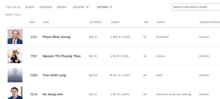 Tài sản các tỷ phú Việt theo ước tính của Forbes. (Ảnh: chụp màn hình)