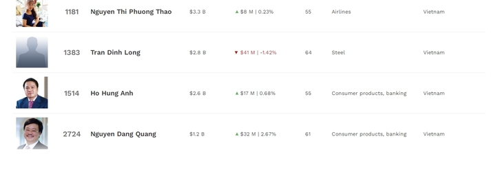 Xếp thứ 3 trong danh sách tỷ phú USD người Việt là ông Trần Đình Long - Chủ tịch Hòa Phát. Tài sản của ông Long giảm nhẹ 41 triệu USD, còn 2,8 tỷ USD, xếp thứ 1.383 thế giới. Phiên 13/8, cổ phiếu HPG giảm 1,4%, xuống 28.100 đồng/cổ phiếu.