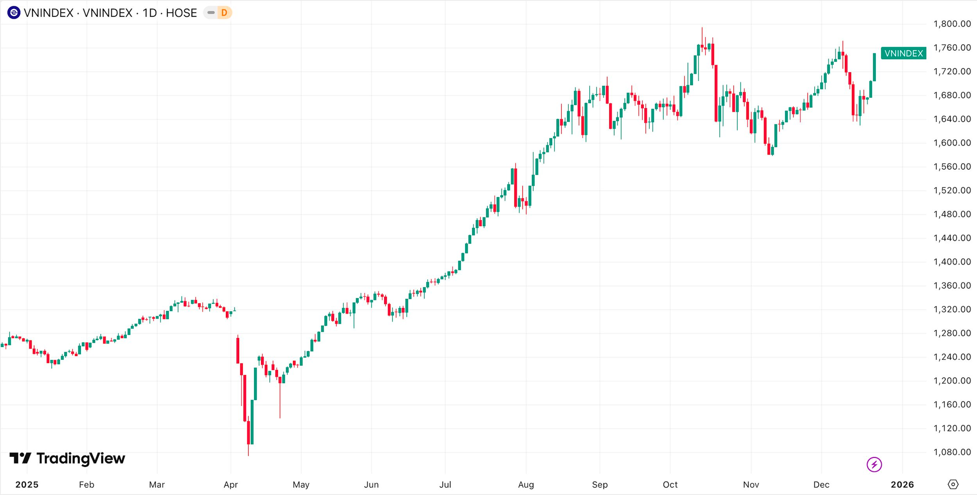 Mức tăng 2,74% của VN-Index đưa chứng khoán Việt Nam trở thành thị trường tăng mạnh nhất Châu Á ngày 22/12.