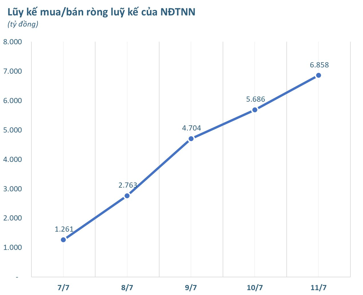 Một trong những động lực thúc đẩy thị trường là sự trở lại mạnh mẽ của dòng vốn ngoại, tương tự như giai đoạn cuối tháng 11/2022. Khối ngoại mua ròng cả 5 phiên trong tuần qua với tổng giá trị mua ròng lên đến gần 7.000 tỷ đồng, cao nhất tính từ đầu năm 2025. Dòng vốn ngoại tập trung chủ yếu tại các cổ phiếu vốn hóa lớn tại nhóm ngân hàng, chứng khoán, thép.