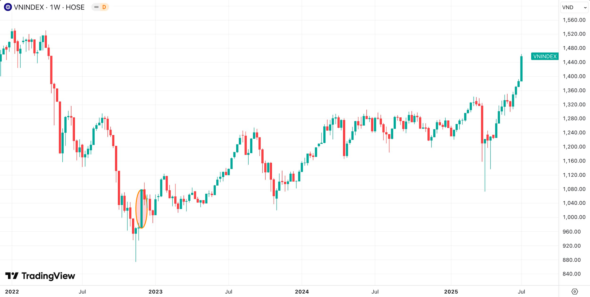Thị trường chứng khoán Việt Nam vừa khép lại một tuần rực rỡ, VN-Index tăng hơn 70 điểm (+5,1%), ghi nhận tuần tăng mạnh nhất kể từ cuối tháng 11/2022. Đây là tuần tăng điểm thứ 4 liên tiếp của chỉ số. Đà tăng này đưa VN-Index leo lên vùng đỉnh hơn 3 năm, kể từ tháng 4/2022 và chỉ còn kém khoảng 70 điểm so với đỉnh lịch sử.