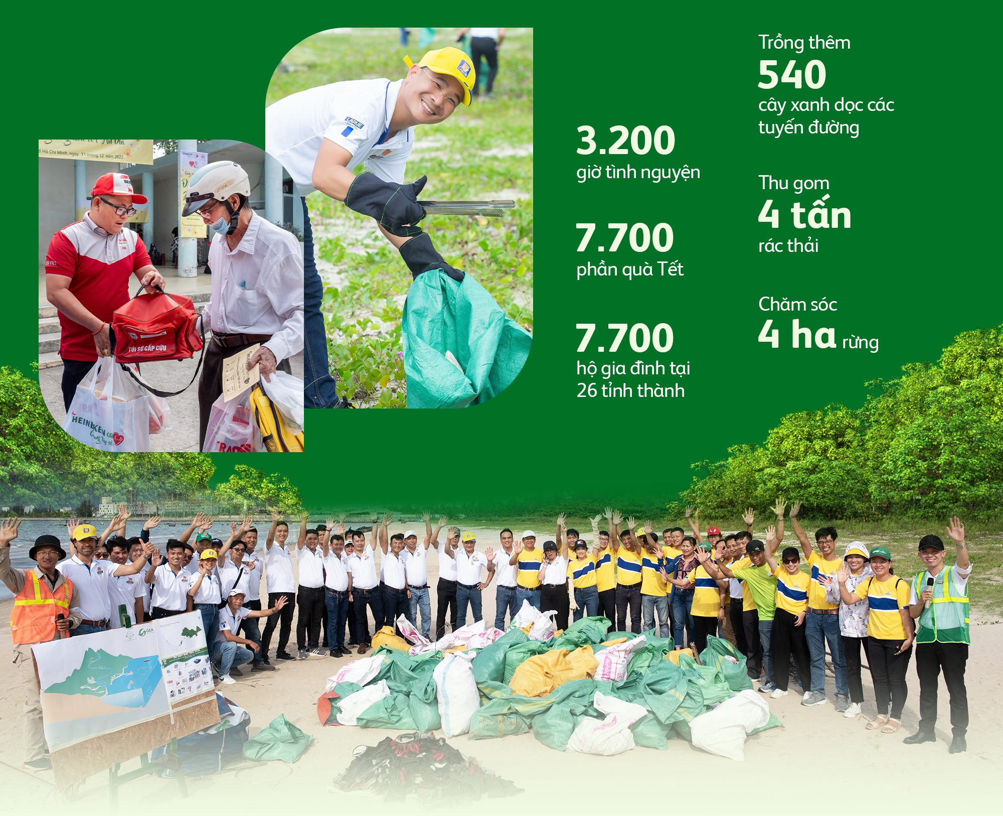 Nhằm khuyến khích tinh thần chung tay hành động của tập thể, HEINEKEN Việt Nam tổ chức chương trình "Chung tay sẻ chia" cùng chuỗi hoạt động ý nghĩa và kêu gọi toàn bộ công nhân viên khắp mọi miền đất nước trực tiếp tham gia đóng góp cho cộng đồng. Năm 2022, chương trình đã ghi nhận nhiều con số ấn tượng trong suốt 3.200 giờ tình nguyện: trao đi 7.700 phần quà Tết cho 7.700 hộ gia đình tại 26 tỉnh thành với tổng số tiền 7,6 tỷ đồng, trồng thêm 540 cây xanh dọc các tuyến đường trong thành phố, thu gom 4 tấn rác thải và chăm sóc 4 ha rừng nhằm góp phần bảo tồn nguồn nước.
