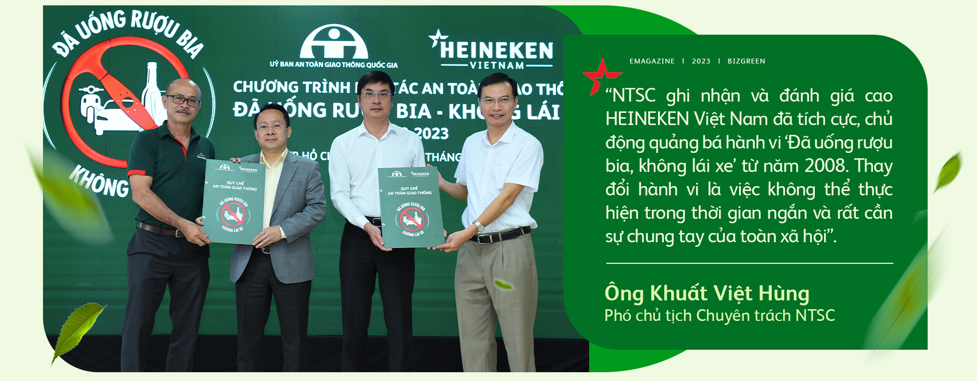 Cùng đồng hành trong chương trình "Đã uống rượu bia, không lái xe", HEINEKEN Việt Nam đánh dấu 12 năm mối quan hệ hợp tác cùng Ủy ban An toàn Giao thông Quốc gia (NSTC) vào cuối năm 2022. Chia sẻ về đối tác của mình, ông Khuất Việt Hùng - Phó chủ tịch Chuyên trách NTSC - cho biết: "NTSC ghi nhận và đánh giá cao HEINEKEN Việt Nam đã tích cực, chủ động quảng bá hành vi ‘Đã uống rượu bia, không lái xe’ từ năm 2008. Thay đổi hành vi là việc không thể thực hiện trong thời gian ngắn và rất cần sự chung tay của toàn xã hội".
