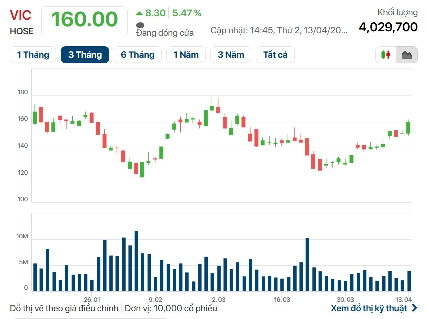 Trên thị trường, cổ phiếu VIC vừa bứt phá 5,47% lên mức 160.000 đồng/cổ phiếu với khối lượng khớp lệnh hơn 4 triệu đơn vị trong phiên 13/04.