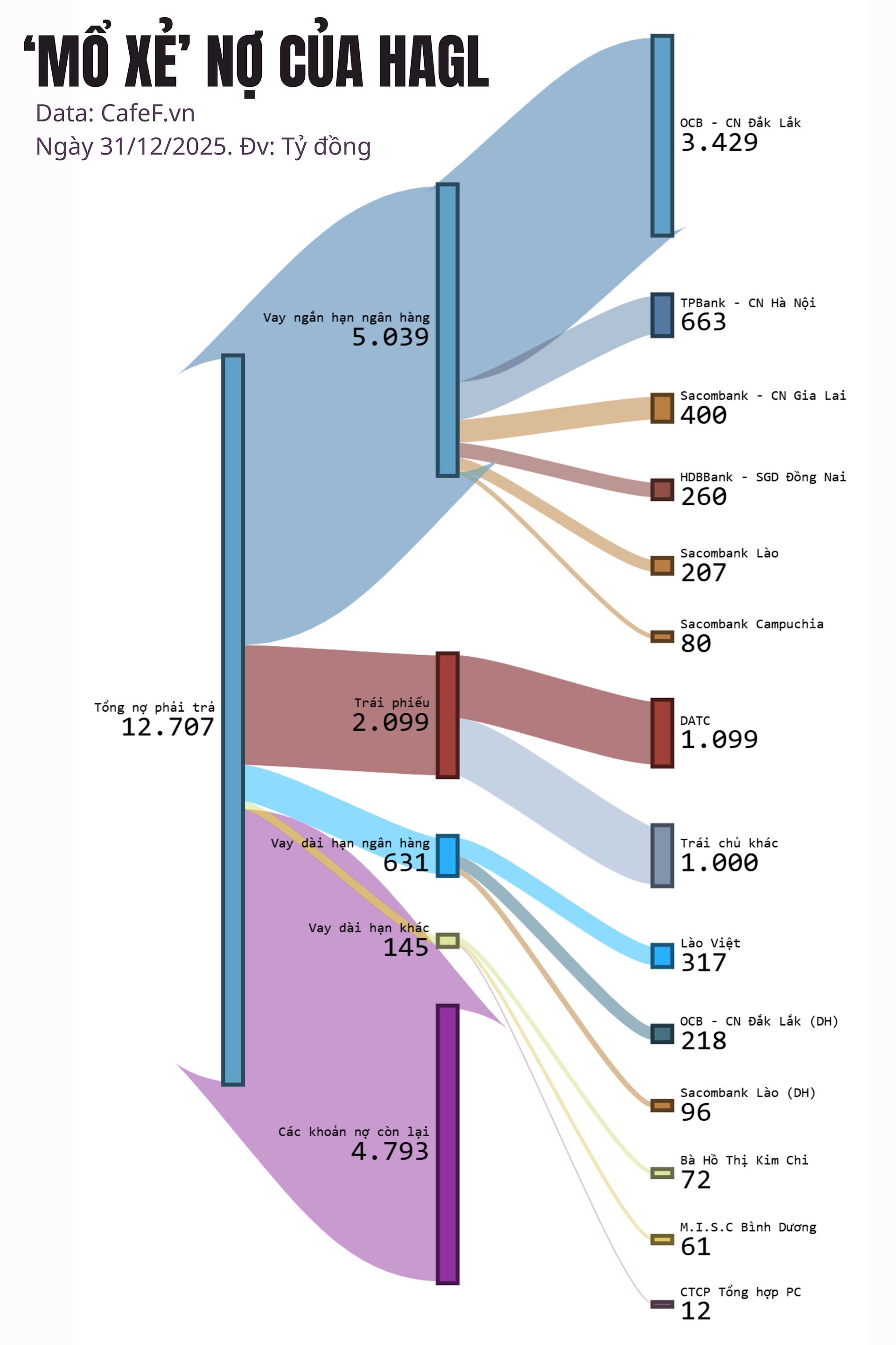 Tại thời điểm 31/12/2025, tổng nợ phải trả của HAGL ở mức 12.707 tỷ đồng, giảm nhẹ so với đầu năm.