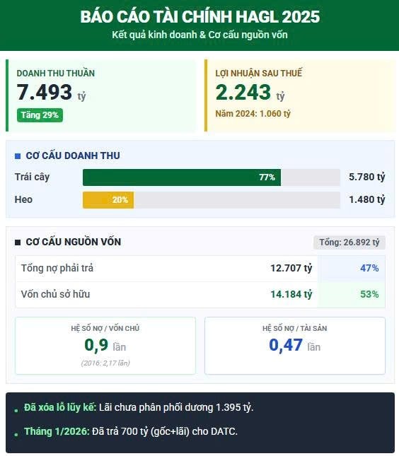Kết quả chung, năm 2025, doanh thu thuần của HAGL đạt 7.493 tỷ đồng, tăng 29% so với cùng kỳ.