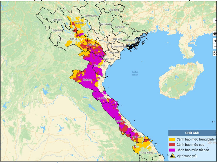 Bản đồ nguy cơ lũ quét, sạt lở đất đá trên các khu vực. (Nguồn: NCHMF)
