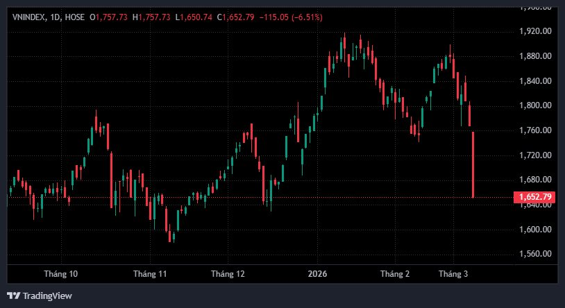 Thị trường chứng khoán Việt Nam vừa trải qua một trong những phiên giao dịch tồi tệ nhất lịch sử vào ngày 9/3 khi làn sóng bán tháo lan rộng trên toàn thị trường. Tâm lý hoảng loạn bao trùm bảng điện tử, VN-Index chốt phiên giảm 115,05 điểm, tương đương 6,5%, xuống còn 1.652,79 điểm – mức giảm mạnh nhất từng được ghi nhận trong lịch sử.