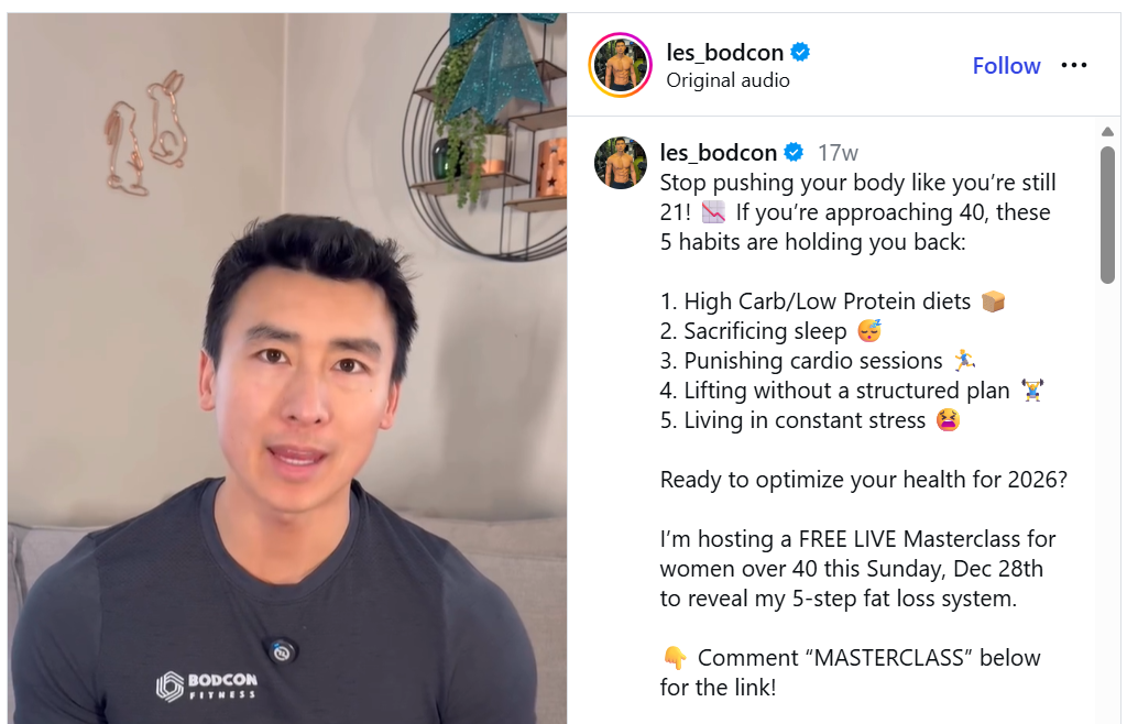 “Tuổi 40 không phải là lúc để chậm lại”, huấn luyện viên cá nhân Leslie Leung nói. “Mà là lúc để tập luyện thông minh hơn, phục hồi tốt hơn và xây dựng sức bền.” Ảnh chụp màn hình bài đăng của Leung trên Instagram