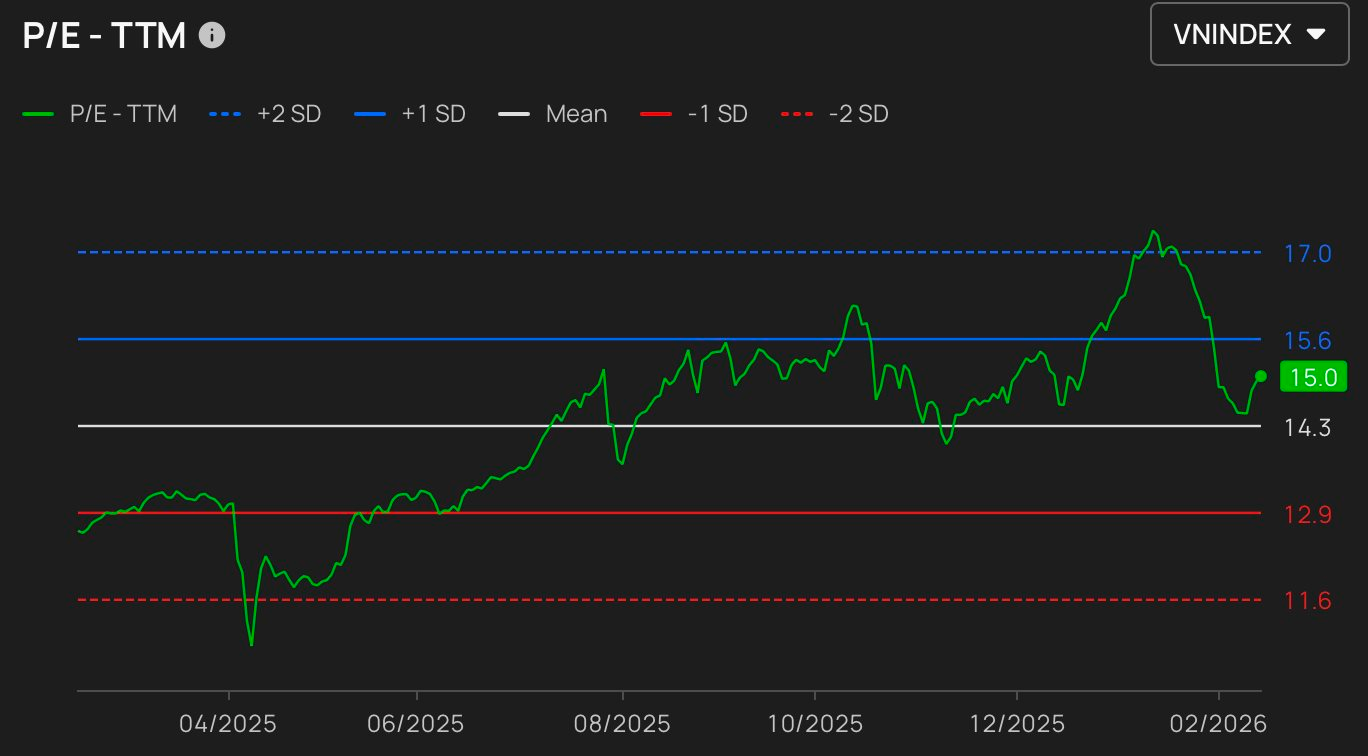 Dù VN-Index đã nhiều lần thiết lập đỉnh lịch sử, nhưng mức định giá thực tế của thị trường vẫn chỉ tương đương giai đoạn cuối năm 2025, thậm chí so với tháng 8/2025 vẫn chưa có sự bứt phá rõ rệt.
