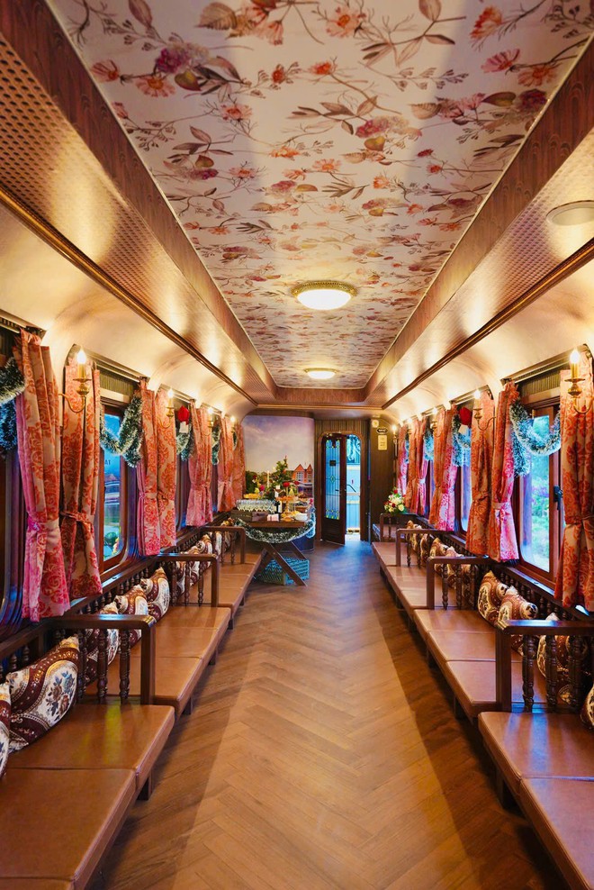 Đó là những mái ngói đỏ thấp thoáng trong sương, vườn rau xanh mướt, cánh đồng hoa, rặng thông nghiêng mình và từng lớp mây bảng lảng theo gió. Đoàn tàu cũng mang hơi thở nghệ thuật qua các góc trưng bày ảnh, vật dụng mô phỏng cung đình và không gian âm nhạc cổ điển du dương, tạo cảm giác như du khách đang được mời dùng trà trong phòng khách của một biệt thự Pháp cổ giữa núi rừng.