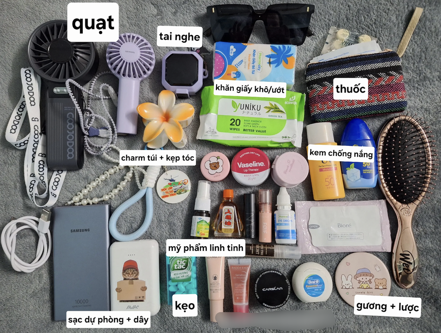 Trong chiếc balo đó, danh sách “bất ly thân” được hội A50 gợi ý bao gồm: sạc dự phòng, quạt cầm tay, áo mưa mỏng, khăn giấy ướt/khô, kem chống muỗi, thuốc chống dị ứng, thuốc tiêu chảy… và cả kem chống nắng. Với các bạn muốn lung linh vào sáng hôm sau, một chút đồ makeup cũng nên có sẵn.