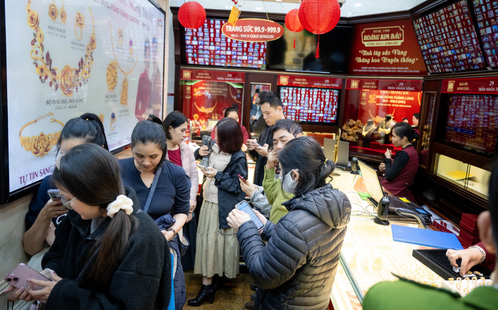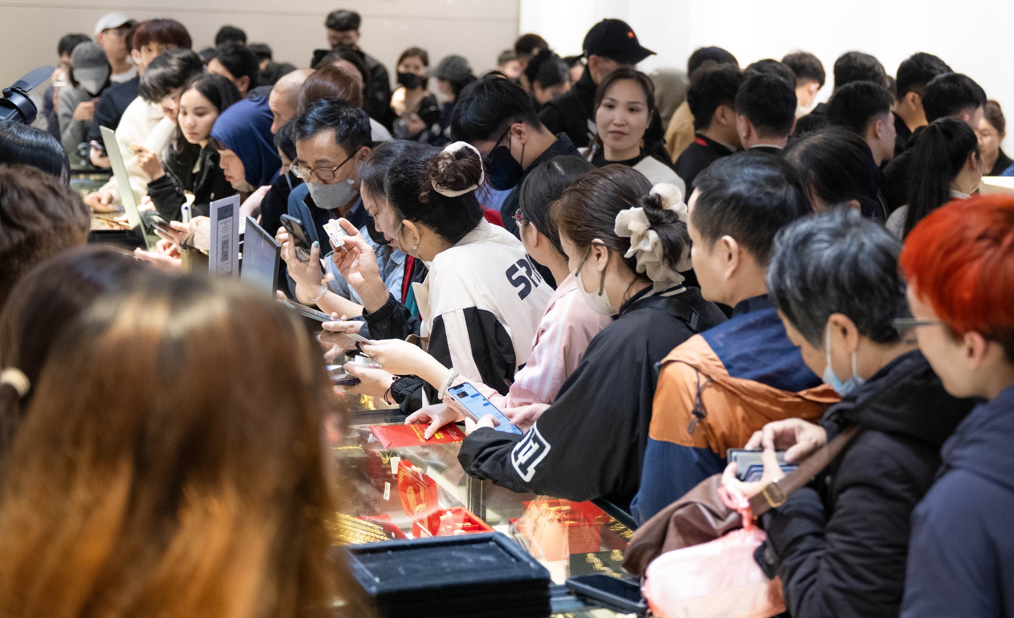 Nhưng cũng có tiệm lại rất đông. Khách xếp hàng chờ giao dịch dài cả mấy chục mét, lượng khách bên trong cửa hàng cũng "chật kín"