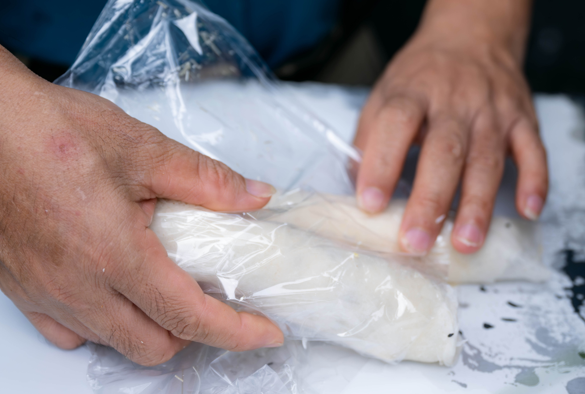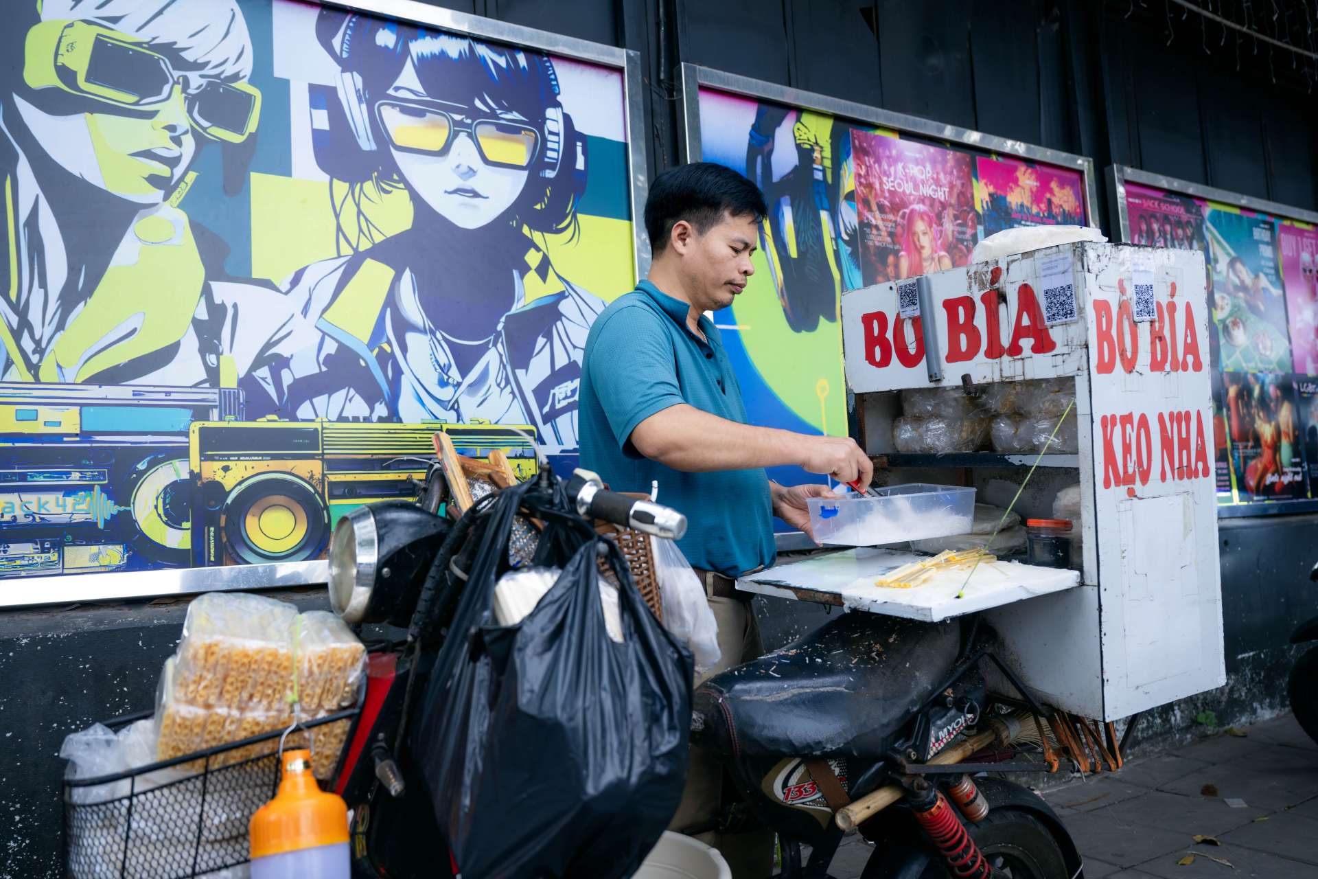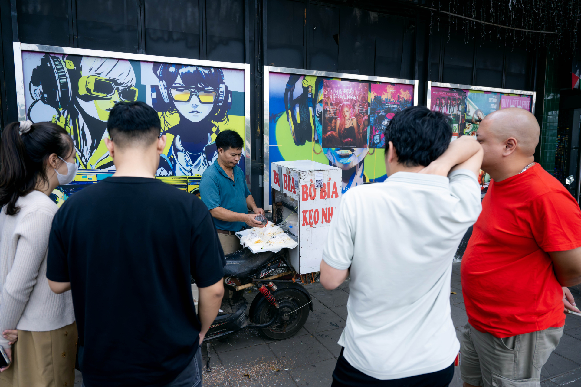 Cuối cùng, sau khi hỏi thêm vài người và đi thêm một vòng nữa, hình ảnh quen thuộc cũng xuất hiện: một xe đẩy nhỏ, anh đứng bên cạnh, tay thoăn thoắt cuốn bò bía cho khách.