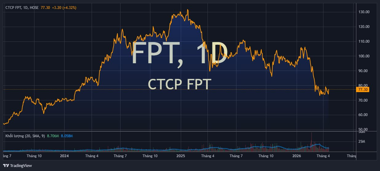 Dù vậy, cổ phiếu FPT vẫn ghi nhận mức giảm khoảng 20% từ đầu năm 2026 và mất tới gần 42% so với đỉnh lịch sử đầu năm 2025, trở thành một trong những mã công nghệ chịu áp lực điều chỉnh mạnh nhất thị trường.