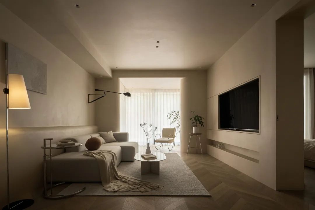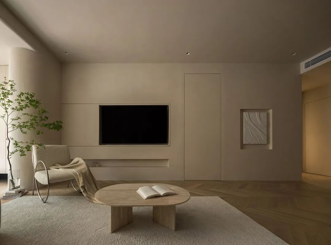 Triệu Hoa không dùng các hệ tủ, TV cũng được gắn âm tường để tạo cảm giác phòng khách rộng rãi, thoáng đãng hơn.