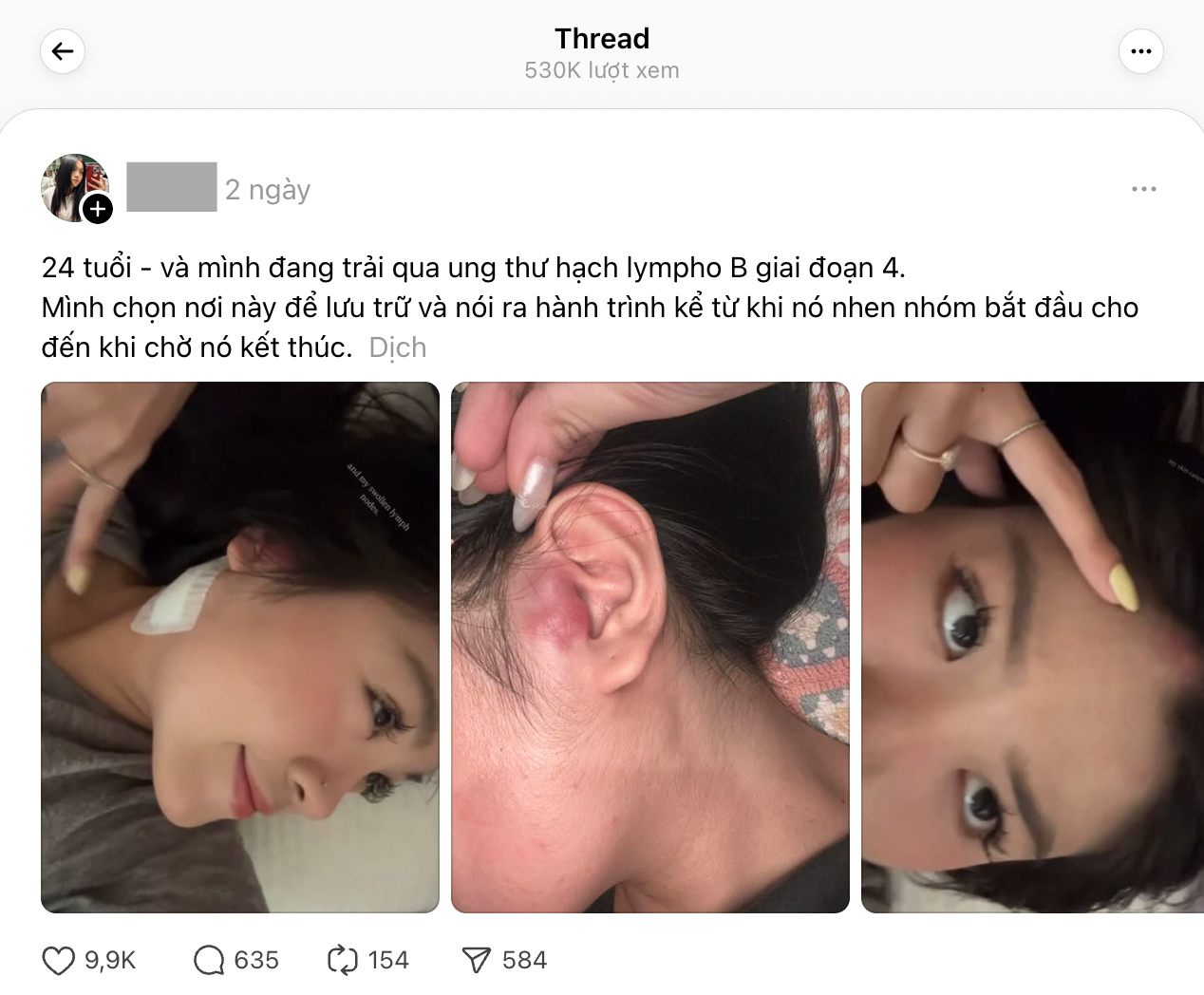 Đó là cách Hồng Vi mở đầu về căn bệnh của mình và hành trình kể từ lúc bệnh mới nhen nhóm đến hiện tại - thời điểm đang chiến đấu để đánh bại nó. Sau 2 ngày đăng tải trên Threads, chia sẻ nhận về nhiều sự đồng cảm với 530k lượt xem và gần 10k lượt yêu thích.