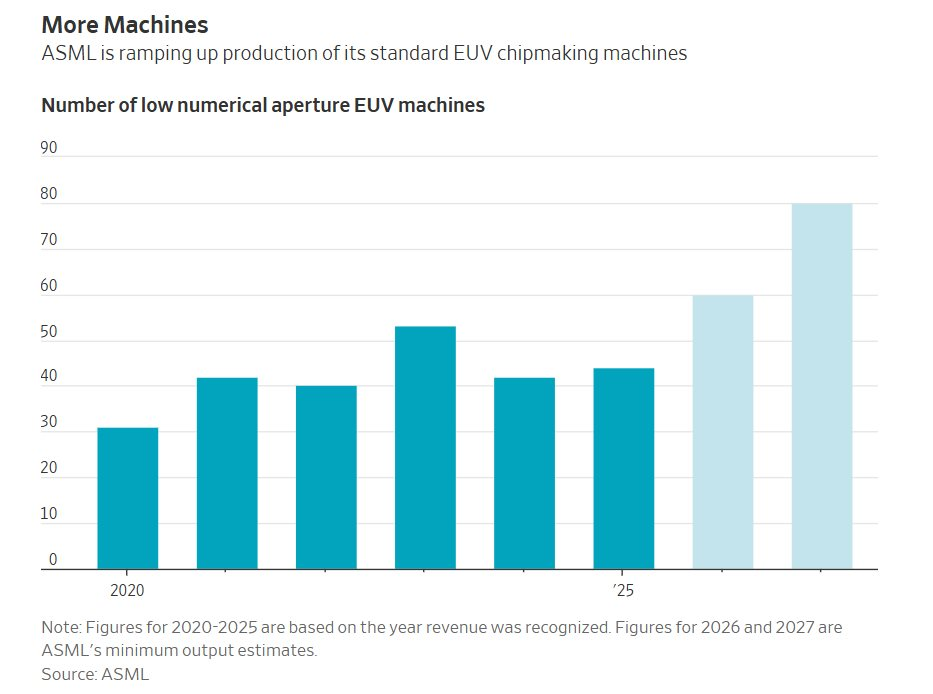 Để giải quyết vấn đề này, ASML dự kiến chi khoảng 2,2 tỷ USD trong năm nay cho bất động sản, hạ tầng và thiết bị, tăng khoảng 20% so với năm 2025. Mục tiêu của họ là xuất xưởng ít nhất 60 máy EUV tiêu chuẩn trong năm nay, tăng 36% so với doanh số năm 2025, và hướng tới con số ít nhất 80 máy vào năm sau.