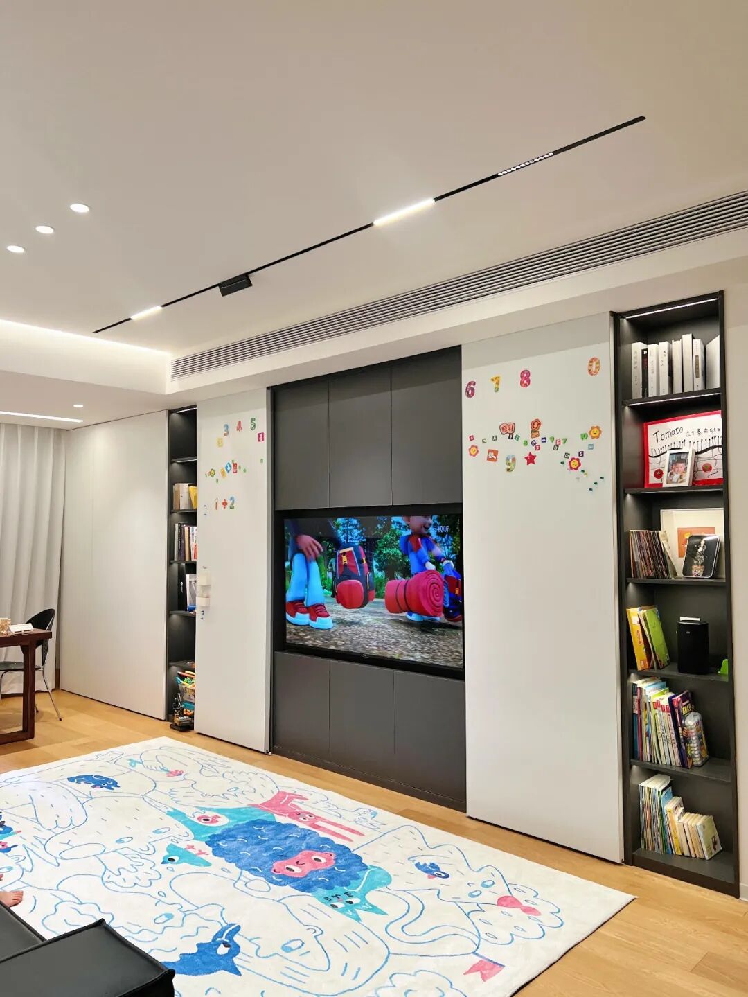 Một phương án hiệu quả là lắp cửa trượt dạng bảng trắng cho một phần giá sách. Khi đóng lại, không gian trông gọn gàng hơn, đồng thời tạo bề mặt để trẻ em vẽ hoặc ghi chú.