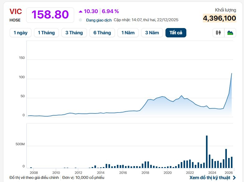 Thị trường chứng khoán Việt Nam khởi động tuần mới đầy hưng phấn nhờ sự dẫn dắt mạnh mẽ từ nhóm cổ phiếu vốn hóa lớn. Tâm điểm đổ dồn về cổ phiếu VIC của Vingroup khi nhanh chóng xác lập mức giá trần lên mốc 158.800 đồng/cp, thậm chí còn trong tình trạng 'trắng bên bán'. Đây đã là phiên tăng mạnh thứ hai liên tiếp của VIC, đưa thị giá áp sát đỉnh lịch sử.
