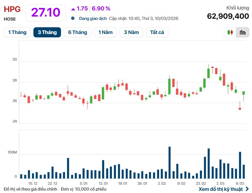 Sau cú giảm sâu, cổ phiếu HPG của Tập đoàn Hòa Phát bất ngờ trở thành tâm điểm khi bứt phá mạnh, dẫn dắt đà hồi phục của thị trường. Phiên sáng 10/3, HPG tăng kịch trần lên 27.100 đồng/cổ phiếu – đánh dấu phiên tăng trần đầu tiên của mã này sau gần một năm, kể từ giai đoạn thị trường chạm đáy vì cú sốc thuế quan.