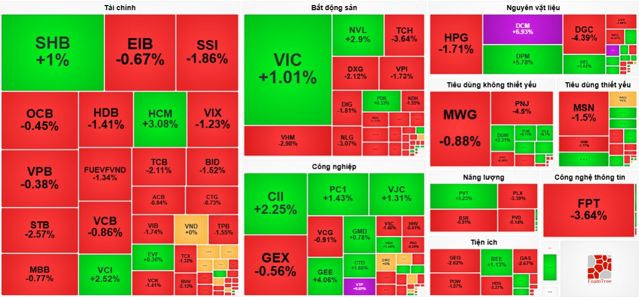 Cổ phiếu chứng khoán cũng điều chỉnh mạnh sau đà tăng nóng ở 2 phiên trước đó, với loạt mã giảm trên 1%, như: SSI, VIX, VCK, FTS, DSE, … Ngược lại, bộ đôi cổ phiếu HCM và VCI bất ngờ tăng bứt phá, khi lần lượt tăng 3,08% và 2,52%.