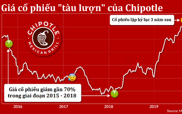 Trong giai đoạn từ năm 2015 đến 2018, cổ phiếu của Chipotle đã giảm gần 70% sau loạt bê bối an toàn thực phẩm. Nhưng tình hình đã thay đổi sau khi Chipotle áp dụng nhiều chiến lược mới, trong đó nổi bật là “thực đơn tối giản” với chỉ 4 món chính.