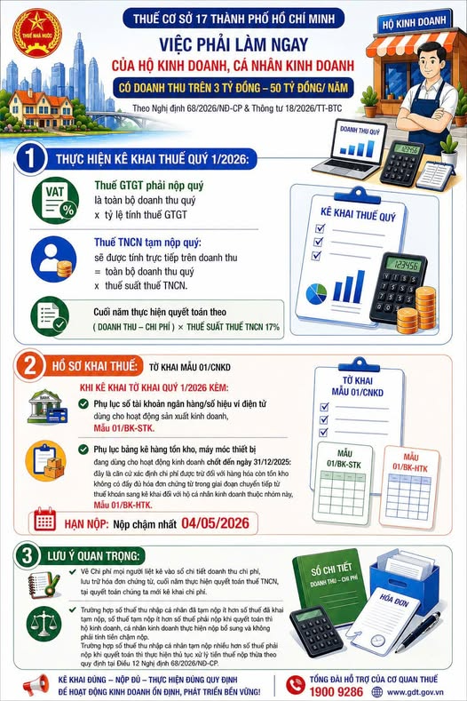 Thuế cơ sở 17 Thành phố Hồ Chí Minh vừa thông tin đến các hộ kinh doanh và cá nhân kinh doanh thuộc nhóm có doanh thu từ trên 3 tỷ đồng đến 50 tỷ đồng/năm về những việc cần thực hiện ngay theo Nghị định 68/2026/NĐ-CP và Thông tư 18/2026/TT-BTC.