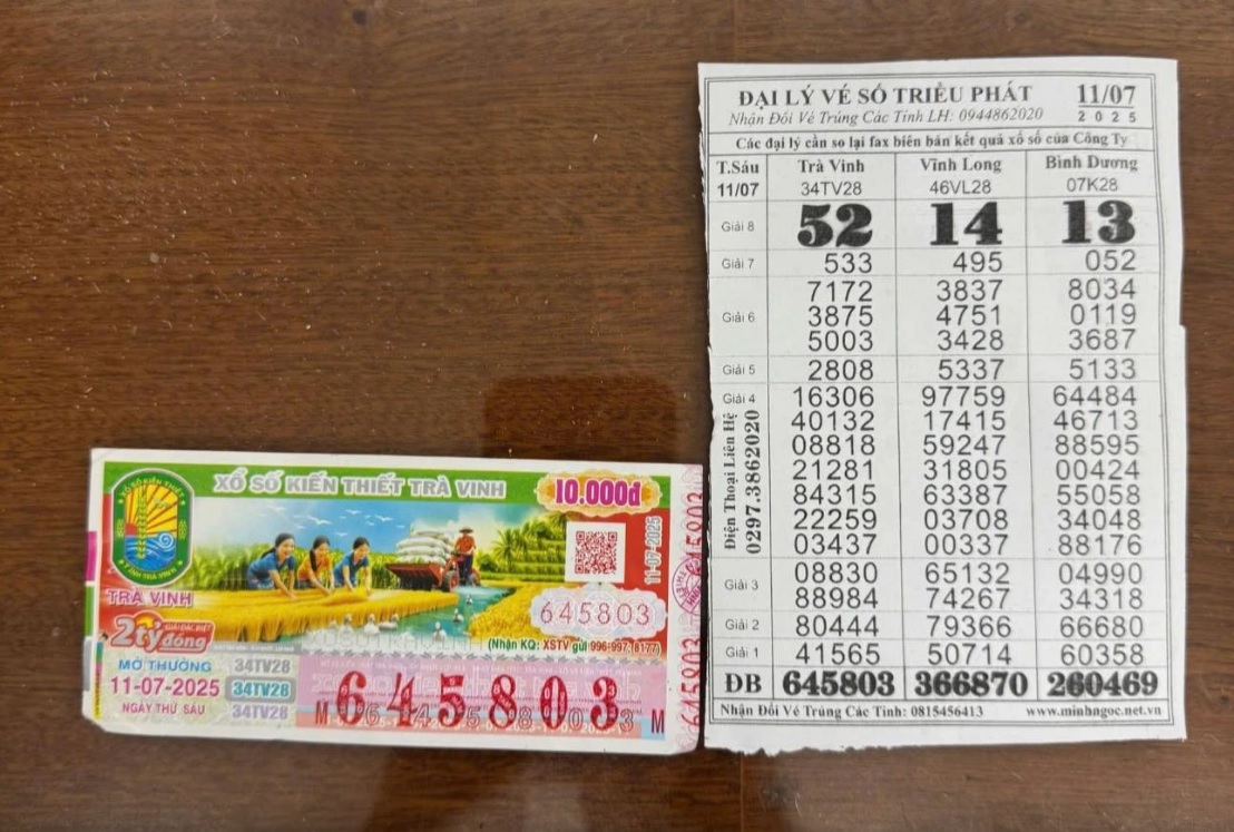 Theo kết quả xổ số miền Nam 11/7, tờ vé số có dãy số 645803 thuộc đài Trà Vinh đã trúng độc đắc. Chủ nhân của tờ vé số này là người phụ nữ bán vé số dạo, hoàn cảnh không khá giả, nhận được 2 tỉ đồng (chưa trừ thuế).