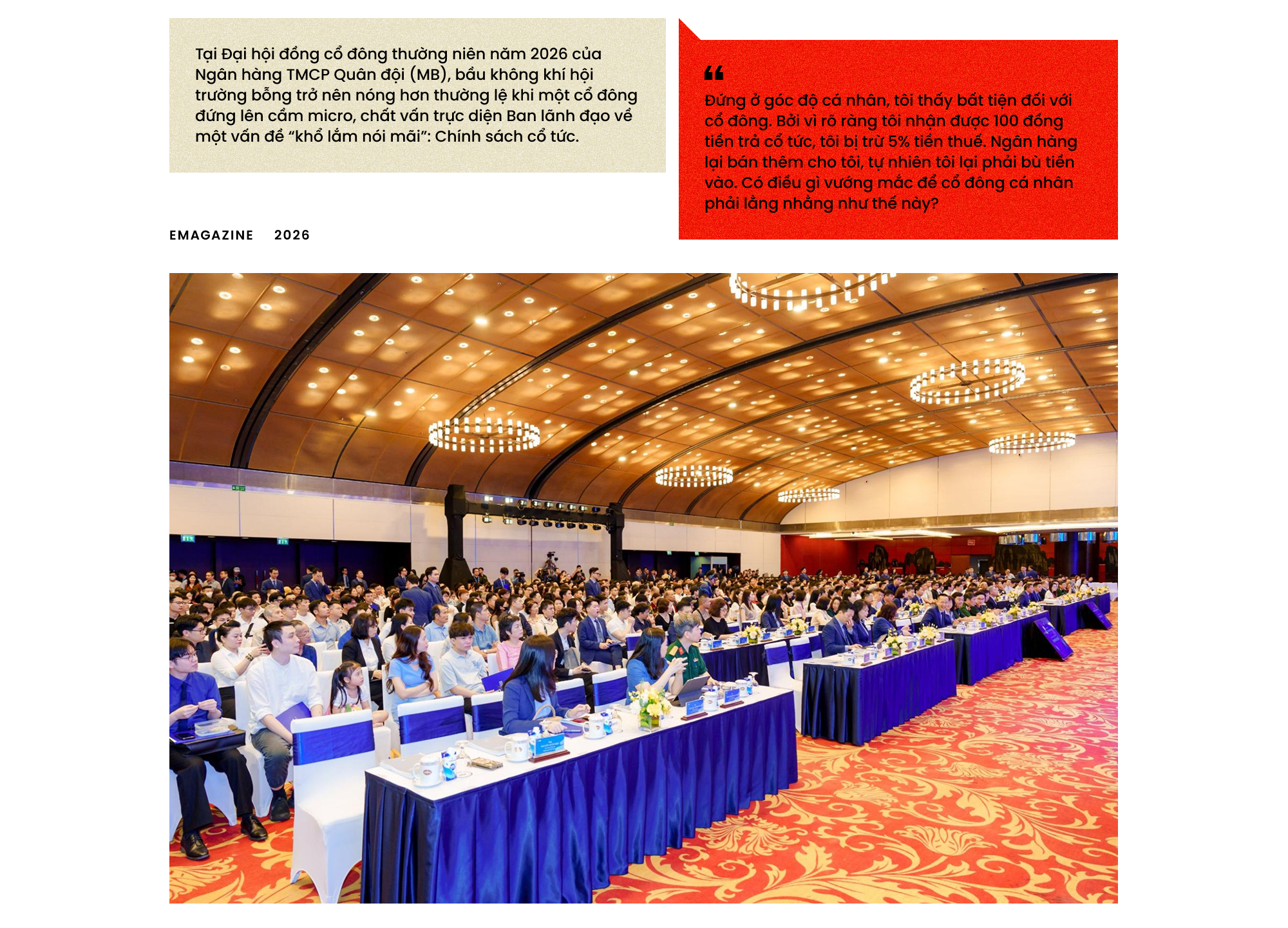 Đáp lại sự gay gắt đó, lãnh đạo MB chỉ bình thản thừa nhận một thực tế rằng ngân hàng không thể làm hài lòng cùng lúc hơn 200.000 cổ đông với đủ mọi khẩu vị khác nhau. Người muốn tiền mặt để chi tiêu, người muốn cổ phiếu để tích sản, người lại muốn ngân hàng giữ vốn để tái đầu tư mở rộng quy mô.