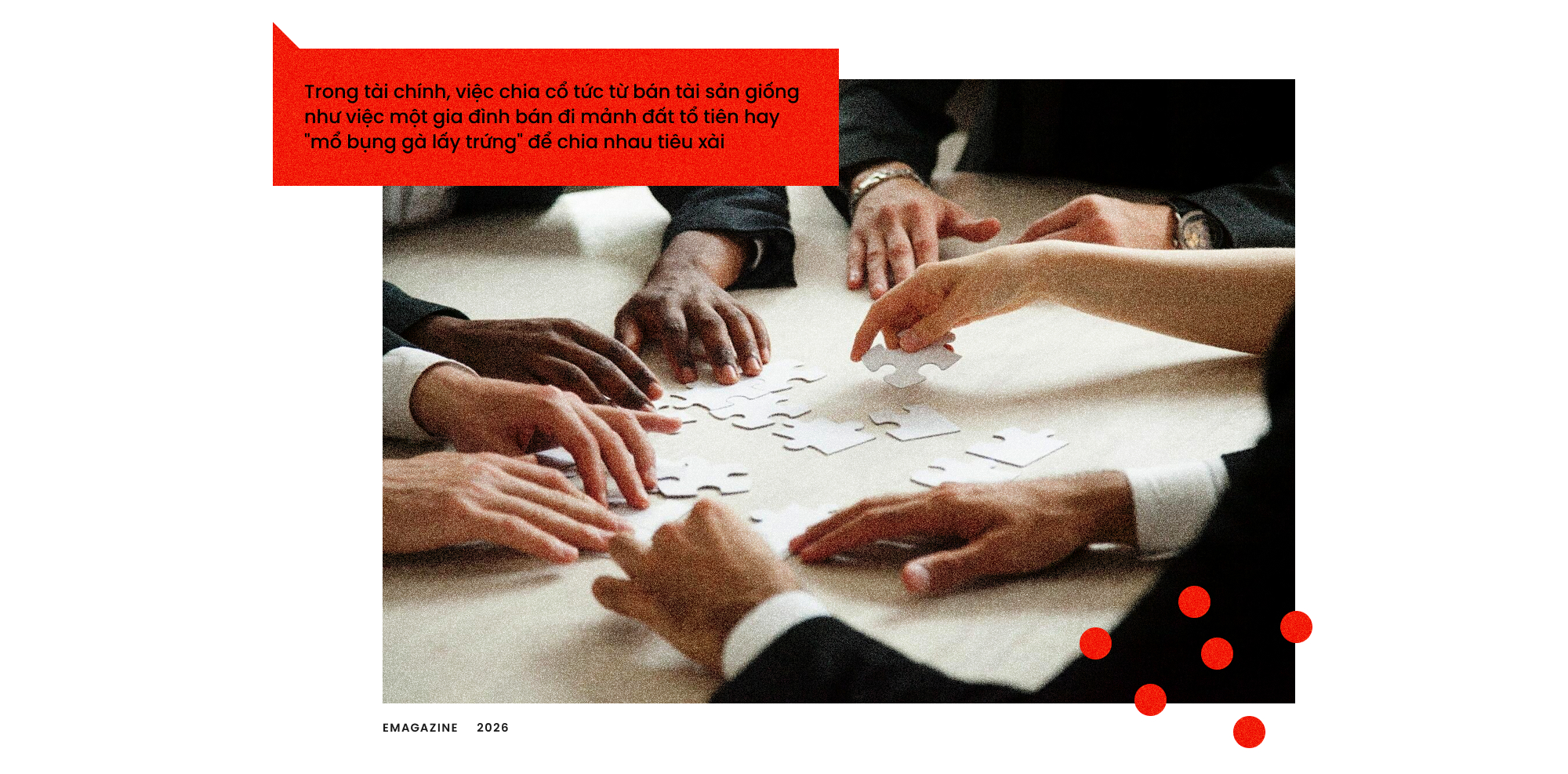 Trong tài chính, việc chia cổ tức từ bán tài sản giống như việc một gia đình bán đi mảnh đất tổ tiên hay "mổ bụng gà lấy trứng" để chia nhau tiêu xài. Năm nay có tiền chia lớn, nhưng những năm sau, khi không còn tài sản để bán, liệu doanh nghiệp có duy trì được mức cổ tức này không? Hay doanh nghiệp sẽ rơi vào tình trạng rỗng ruột, mất đi động lực tăng trưởng và giá cổ phiếu sẽ lao dốc không phanh sau khi đã được "vắt kiệt" để chia nhau? Đó là rủi ro về tính bền vững mà không phải ai cũng nhìn thấy đằng sau những xấp tiền mặt chảy vào tài khoản. Dù thuế cổ tức (như cổ đông của MB đã đề cập) là điều ai cũng dễ dàng nhìn ra.