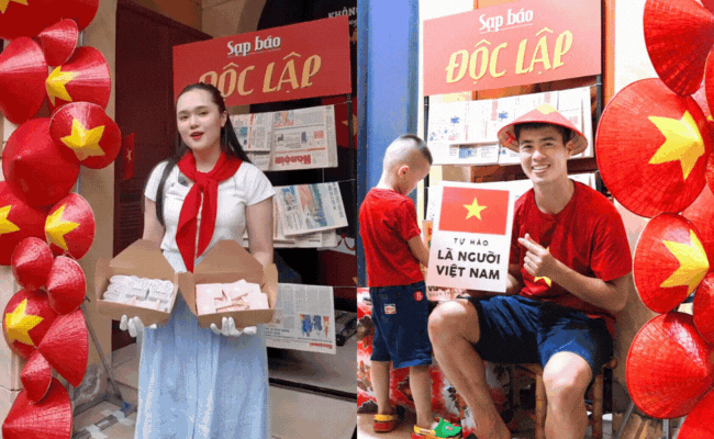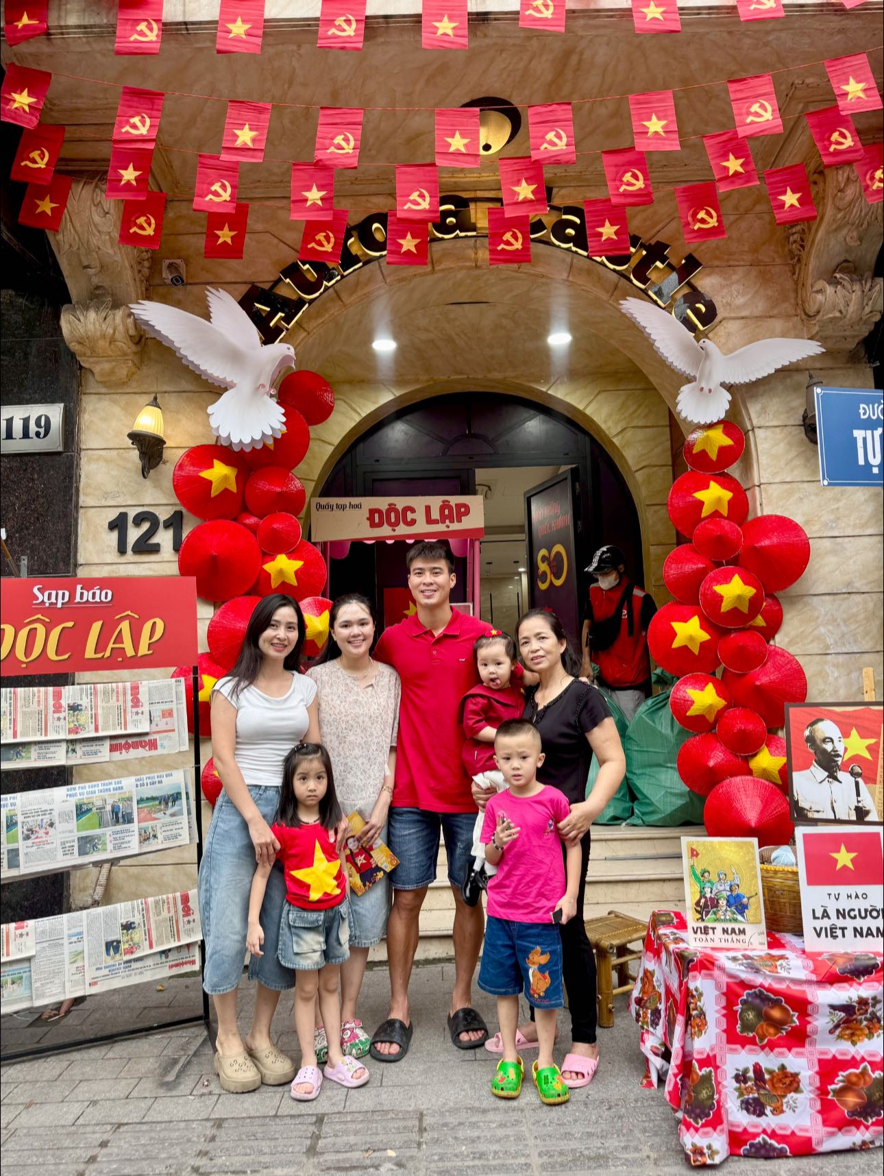 Căn nhà 6 tầng bề thế của gia đình bộ đôi tuyển thủ Đỗ Duy Mạnh - Nguyễn Văn Quyết nằm trên mặt phố Nguyễn Thái Học - nơi đoàn diễu binh, diễu hành đi qua - từ nhiều ngày nay đã được trang hoàng rực rỡ với cờ đỏ sao vàng, nón lá đỏ gắn sao vàng cùng gian "sạp báo Độc Lập" đặc trưng. Đây vừa là điểm phát quà, vừa là góc check-in hấp dẫn đối với người dân và giới trẻ khi ghé qua.