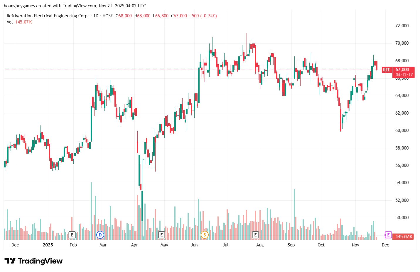 Động thái bán ra của ông Bình diễn ra khi cổ phiếu REE đang trong xu hướng hồi phục tích cực sau nhịp điều chỉnh ngắn hạn. Tính đến phiên 21/11, thị giá REE giao dịch quanh mốc 67.400 đồng/cp, tăng hơn 20% so với đầu năm 2025 và tăng khoảng 60% so với đầu năm 2024.